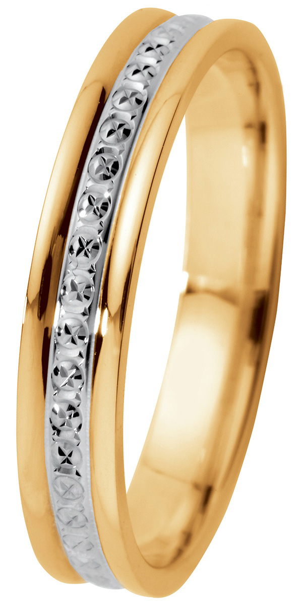 - Puolipyöreä 3,5 mm leveä 14 karaatin keltakullasta valmistettu kihlasormus, jonka keskellä on timanttileikkaus ja rodinointi.