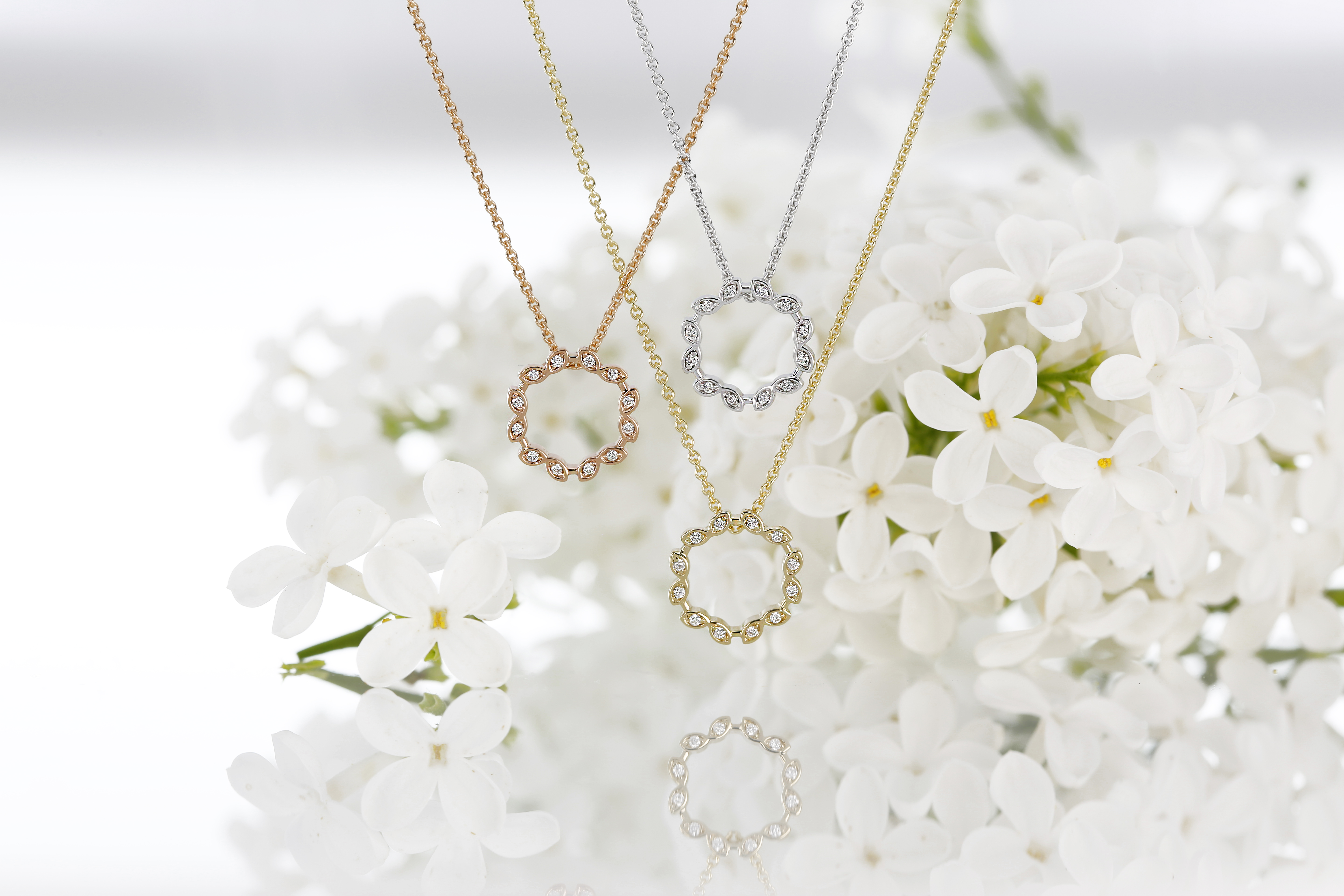 Swan-timanttiriipuksessa on siro lehtikuvio. Kehän jokaiseen lehdykkään on istutettu pieni timantti. Timanttien yhteispaino 0,06 ct H/SI. Design Sami Laatikainen.