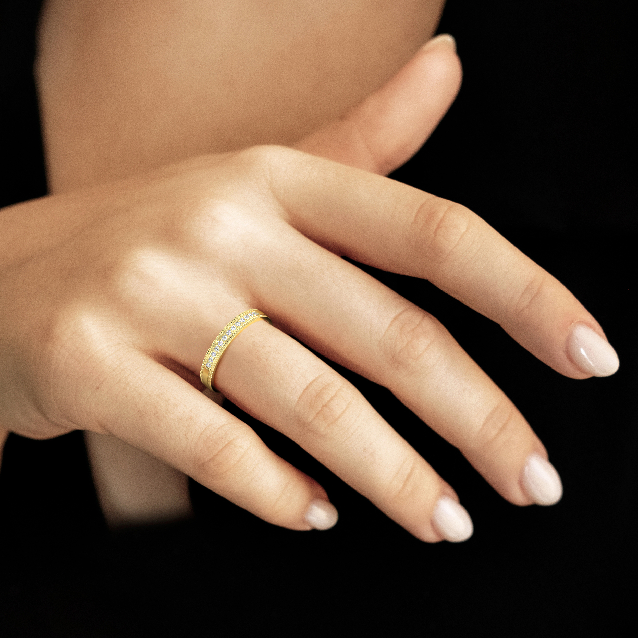 Amelie-sormuksissa yhdistyvät yksinkertaisuus ja eleganssi. Sormusta kehystää kiiltäväksi leikattu krysanttireunus, joka tuo ripauksen säihkettä elämään. Kauniissa rivisormuksessa on 13 0,005 ct H/VS timanttia. Design Sami Laatikainen.
