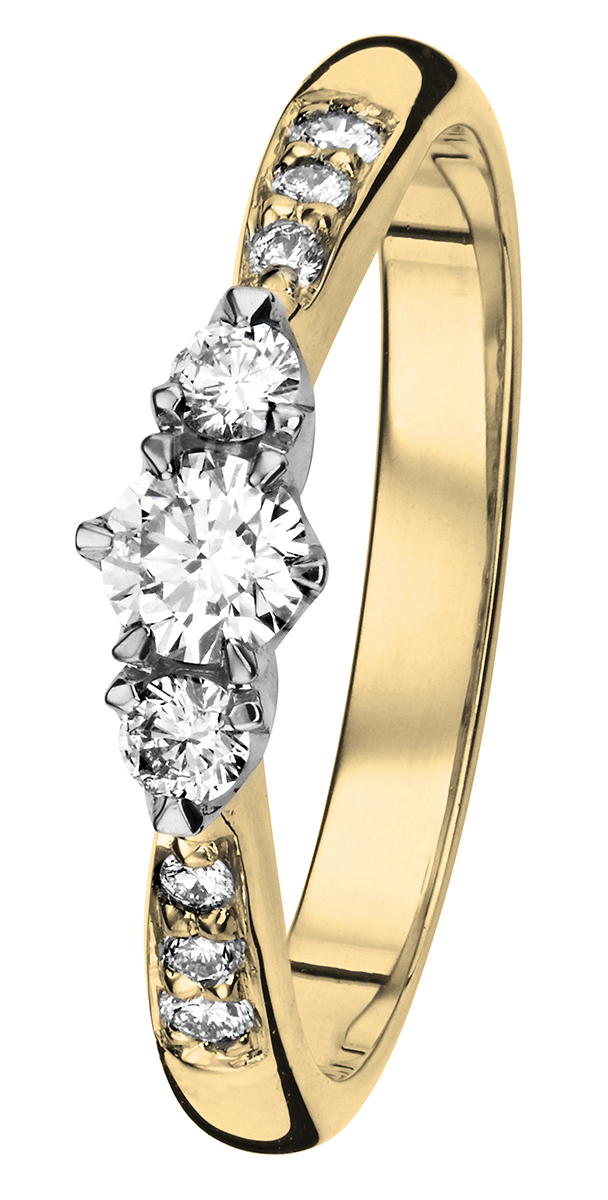 Helene-korujen kolme keskustimanttia symboloivat rakastavaisten yhteistä menneisyyttä, tulevaisuutta ja tätä hetkeä. Helene-timanttisormuksessa yht. 0,31 ct H/SI. Design Assi Arnimaa.